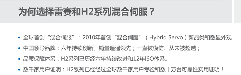 H2系列属于雷赛智能第二代混合伺服驱动器,对比上一代HBS系列混合伺服在功能、控制算法和工艺多做了多处优化与改进,属于目前市面上顶级的混合伺服驱动。配套HSM系列混合电机,在不少速度低于2500RPM的应用场合,可提供比交流伺服更好的综合性能,且系统成本仅相当于交流伺服系统的一半左右。配套雷赛智能HSM系列电机,是升级步进系统和优化伺服系统的佳选。H2系列将逐步取代HBS系列第一代混合伺服;非HBS系列现有客户,建议直接选择H2系列。更多...