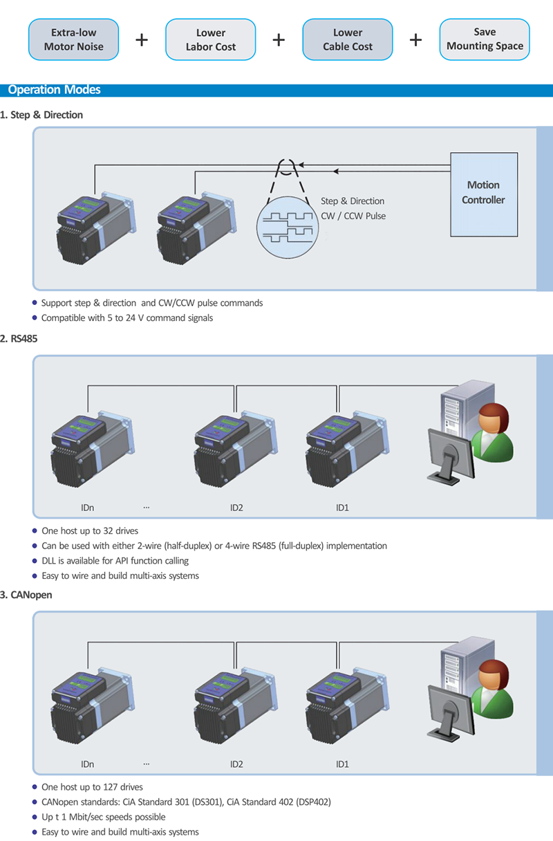 iST系列是集高性能步进电机和数字步进驱动于一体的高集成度步进系统。采用专用DSP芯片和优化的控制算法技术,安装兼容传统步进电机的尺寸,免除电机与驱动器之间的连接线缆,节省大量接线人工,并减少电线之间的电磁干扰,降低大量接插件和电线间连接不牢靠所带来的可靠性问题和维护成本,减少安装空间。为设备制造厂商提供了一种高可靠、安装简洁的高集成度步进解决方案。 |