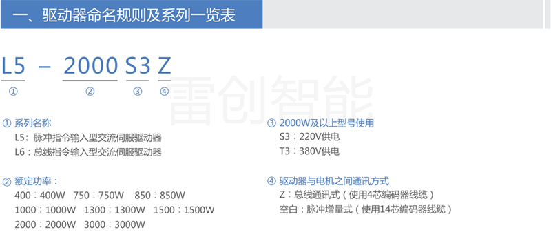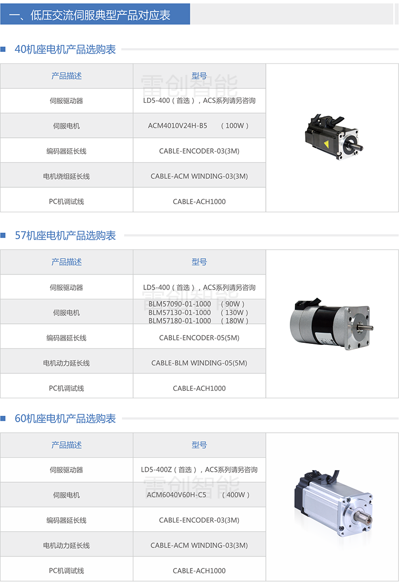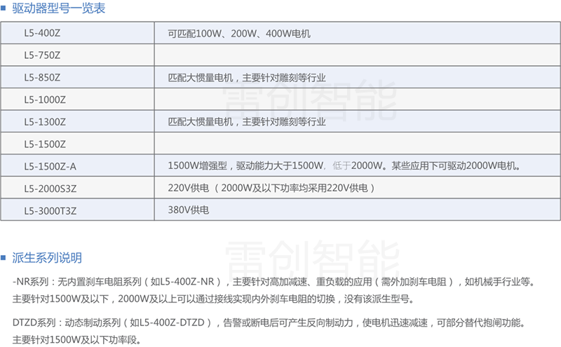 下面针对各系列产品,提供通用的产品选型和配套信息以供参考;特殊应用的优化选型请咨询雷创智能或雷赛智能工程师。
