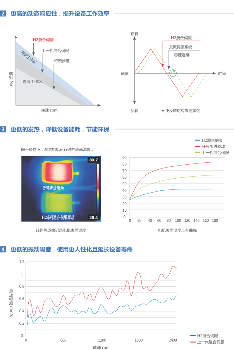 * 更节能,电机温升比步进产品低40°C以上;